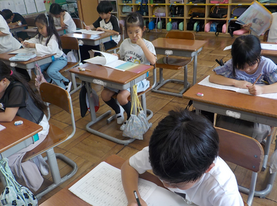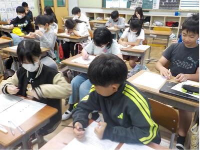 先生からの質問に対して、多くの児童が手を挙げて発言していました。