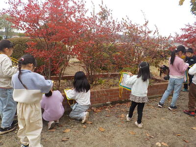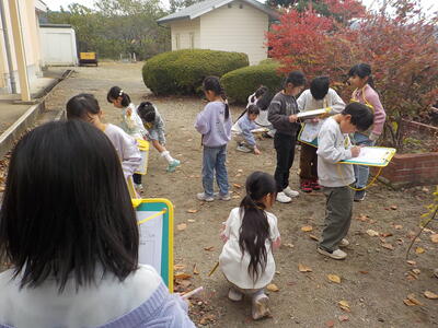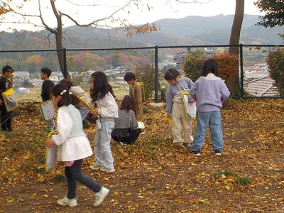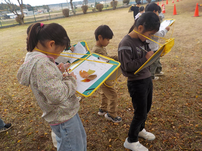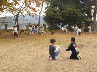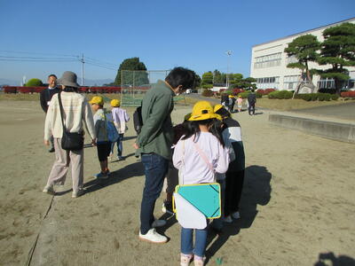 1年生が校庭に秋を探しに行きました。校庭へ出発!