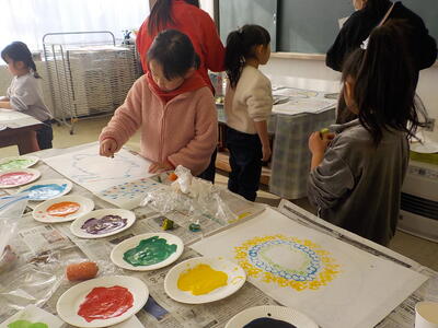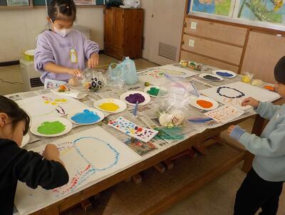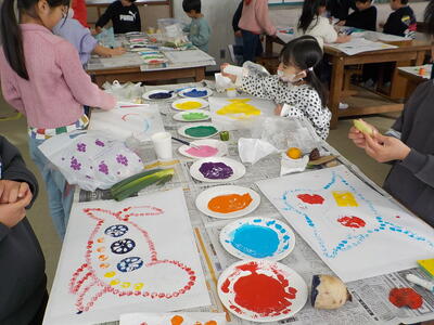 1年生がスタンピングの学習をしました。野菜やトイレットペーパーなど、様々な物の断面に絵の具をつけて紙に押しました。