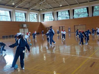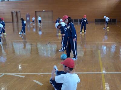身体を温めるように準備運動をしたり、ボールを使った準備運動をしたりしました。