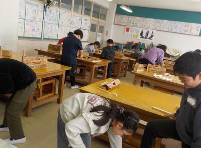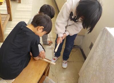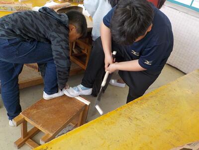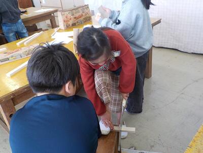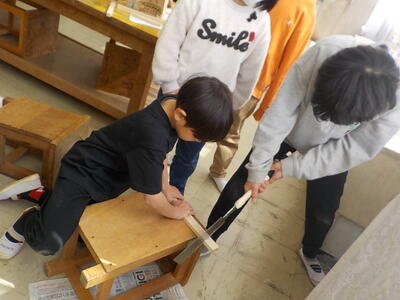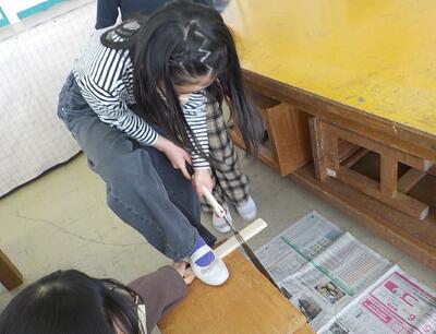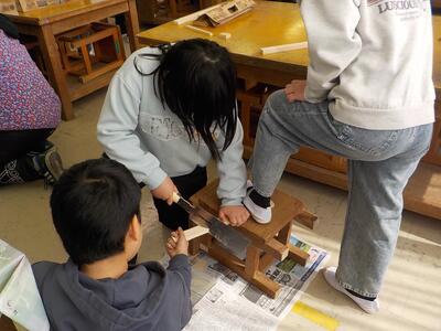 3年生が図工の時間に、のこぎりを使って木材を切りました。