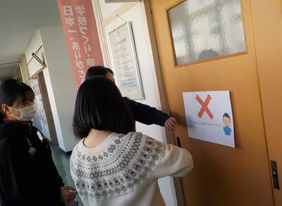 今日のなかよし集会は全校生によるかくれんぼです。事前に6年生が校舎内にかくれてはいけない場所を示す表示を掲示しました。