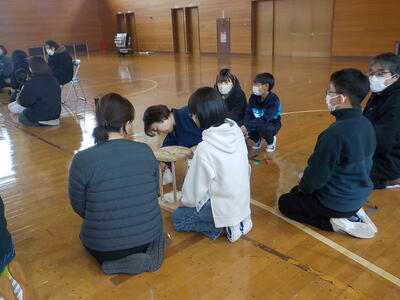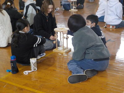 5年生が部会行事として大関組紐作りを行いました。まず、組紐の作り方を教わりました。