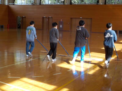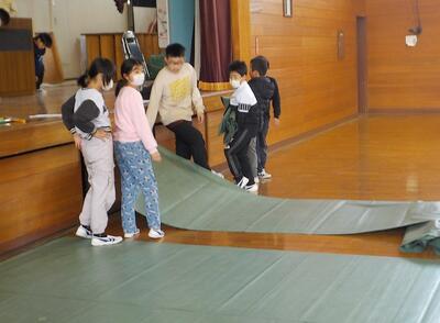 卒業式の練習が本格的に始まります。4・5年生が卒業式の会場準備を行いました。掃除をしたりシートを敷いたりしました。