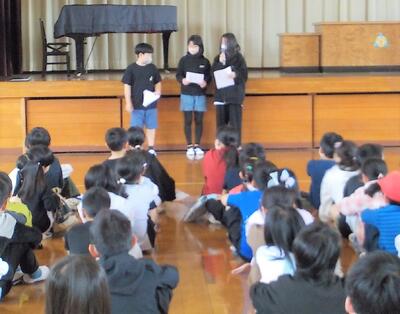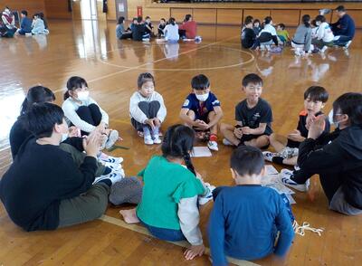 撮影の合間には、それぞれの班で6年生が中心となって企画したレクリエーションを楽しんでいました。「ハンカチ落とし」や「だるまさんが転んだ」など、学年を越えて交流し、親睦を深めました。頼もしい最上級生のおかげで、どの班もすっかり仲良くなれたようです。