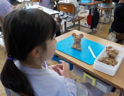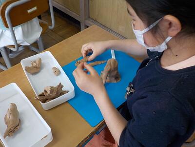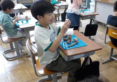 2年生の教室は、ただいま小さな芸術家たちの作業場に変身中! 手全体の力を使って粘土を柔らかくしたり、指先でつまんで小さなパーツを作ったり。 真剣な眼差しで作品を見つめる表情からは、ものづくりの楽しさが伝わってきます。