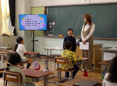 大型モニターに映し出されたカラフルなスライドを使いながら、「すきなたべもの」や「すきないきもの」を一生懸命に話す子どもたち。保護者はお子様のいいところを紹介してくれました。