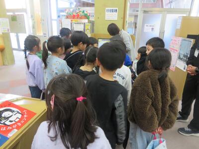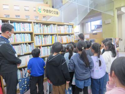 最後に、黒羽図書館に行きました。図書館にはたくさんの本があること、本の背表紙に付いている青ラベルと赤ラベルのひみつなど、いろいろなことを教えてもらいました。