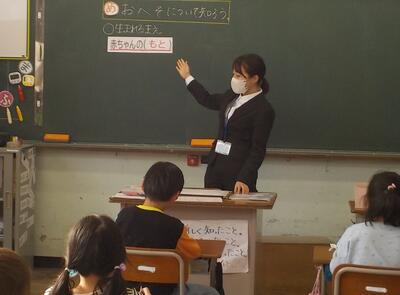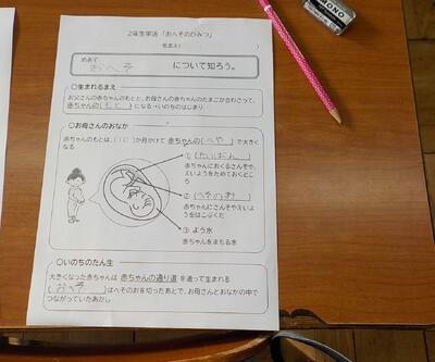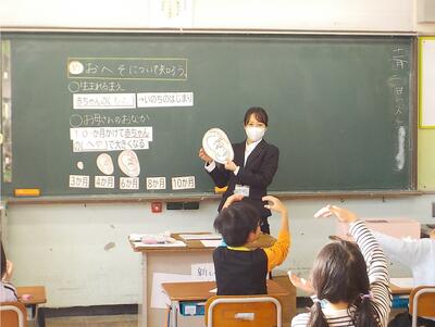 2年生が学級活動の時間に「おへそのひみつ」について学習しました。教育実習の先生と2年生の先生から教わりました。
