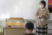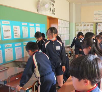 不審者が校内に侵入してきたと仮定して避難訓練をしました。不審者の侵入を防ぐためのバリケードを机で作りました。