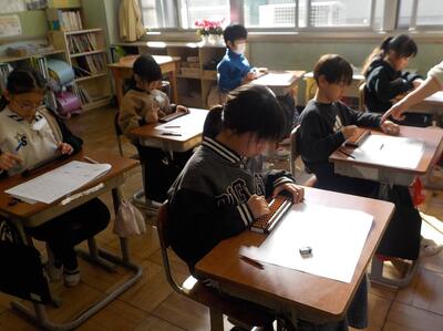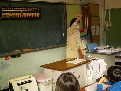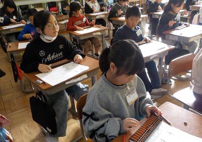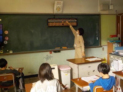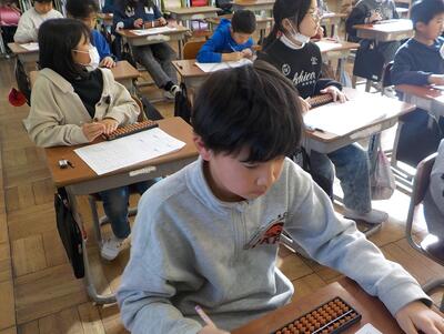 そろばんの先生にお越しいただき、3年生がそろばん教室に参加しました。