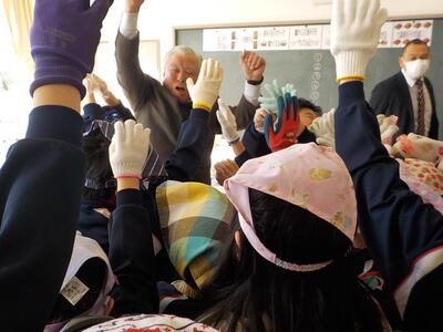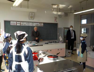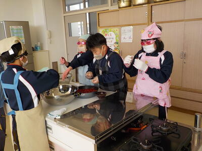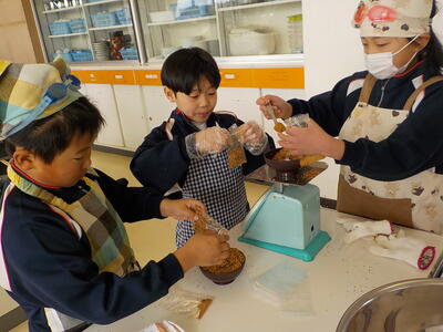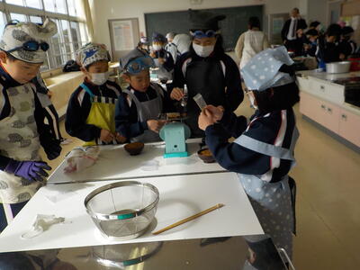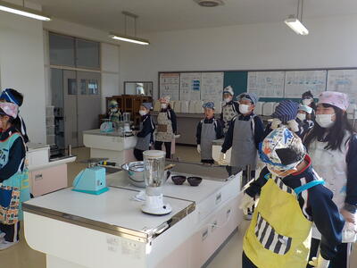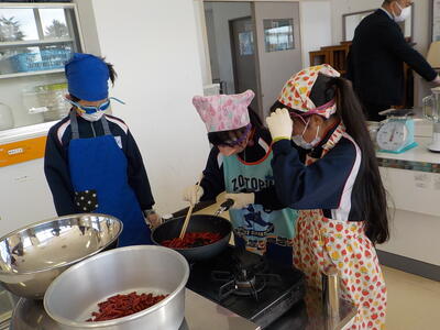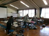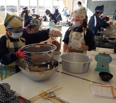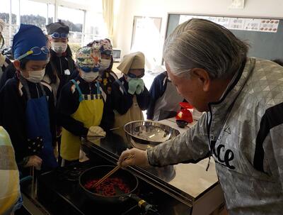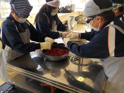 3年生が講師の方にお越しいただき、七味唐辛子を作りました。作り方を教わったあと、円陣を組んで気持ちを高めました。