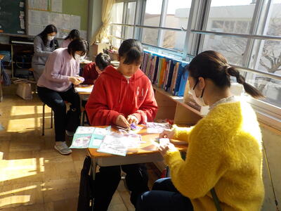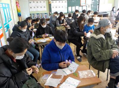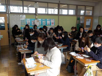 6年生が部会行事でコサージュを作りました。家の人と一緒に、コサージュの部品を上手に組み合わせ、素敵なコサージュが完成しました。